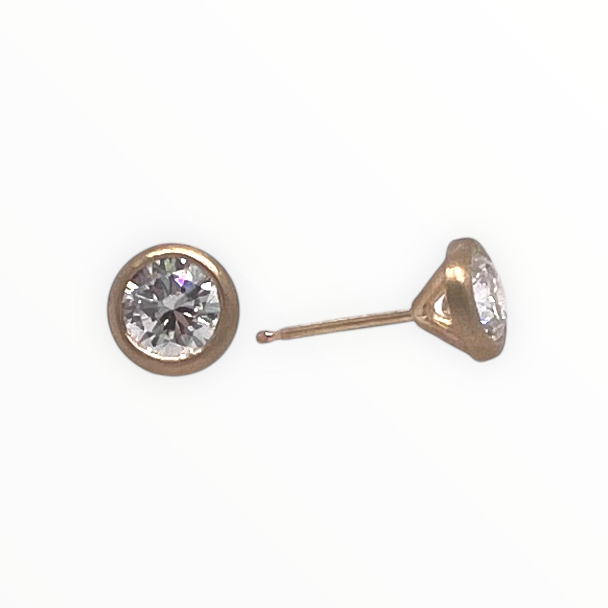 1.3 tcw LAB diamonds- F color, VS clarity, bezel set in 14k matte finish yellow gold cocktail style stud earrings.