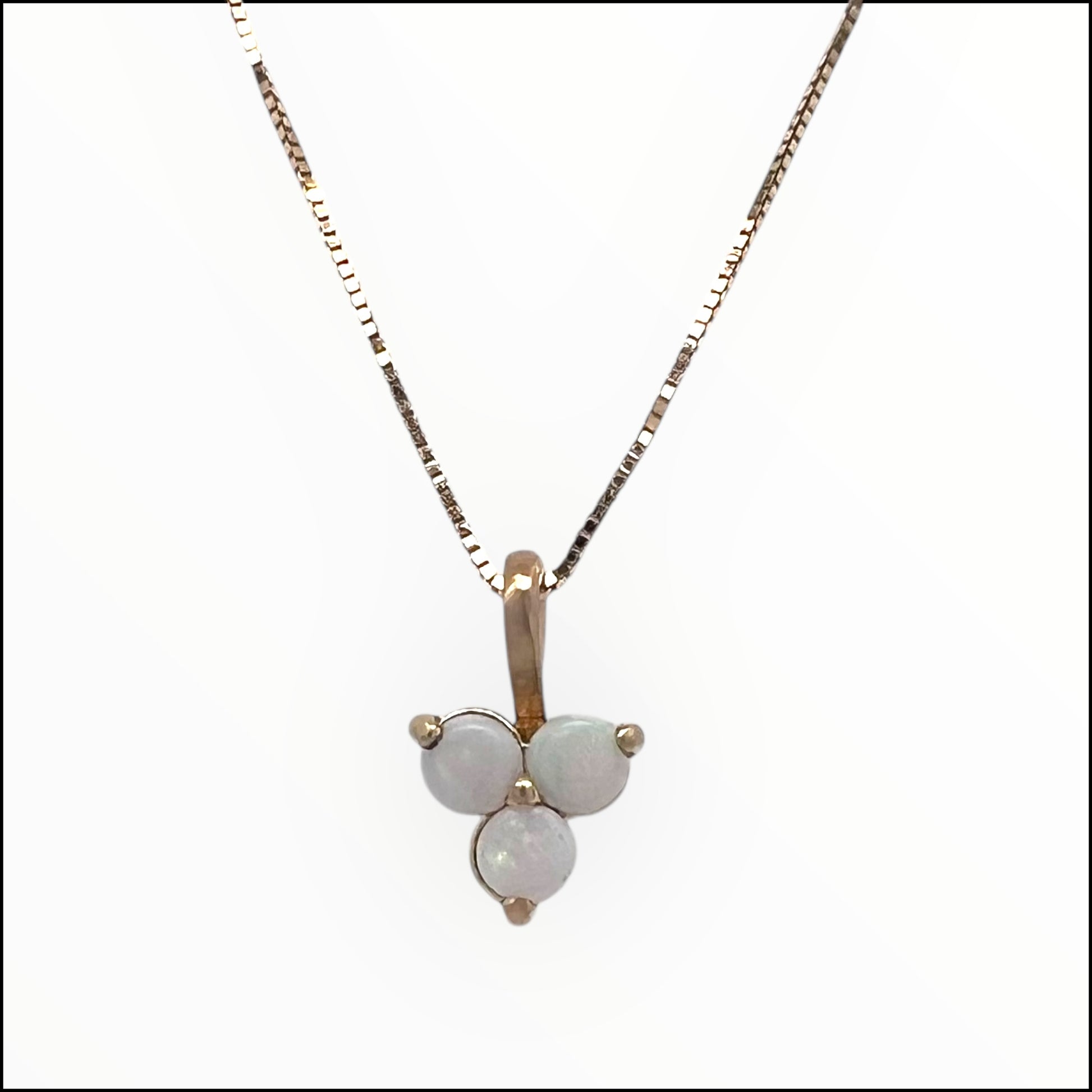 An 18k yellow gold cluster of 3 tiny opals with bright flashes of pink, blue and green slides along a thin, but sturdy 14k yellow box chain.