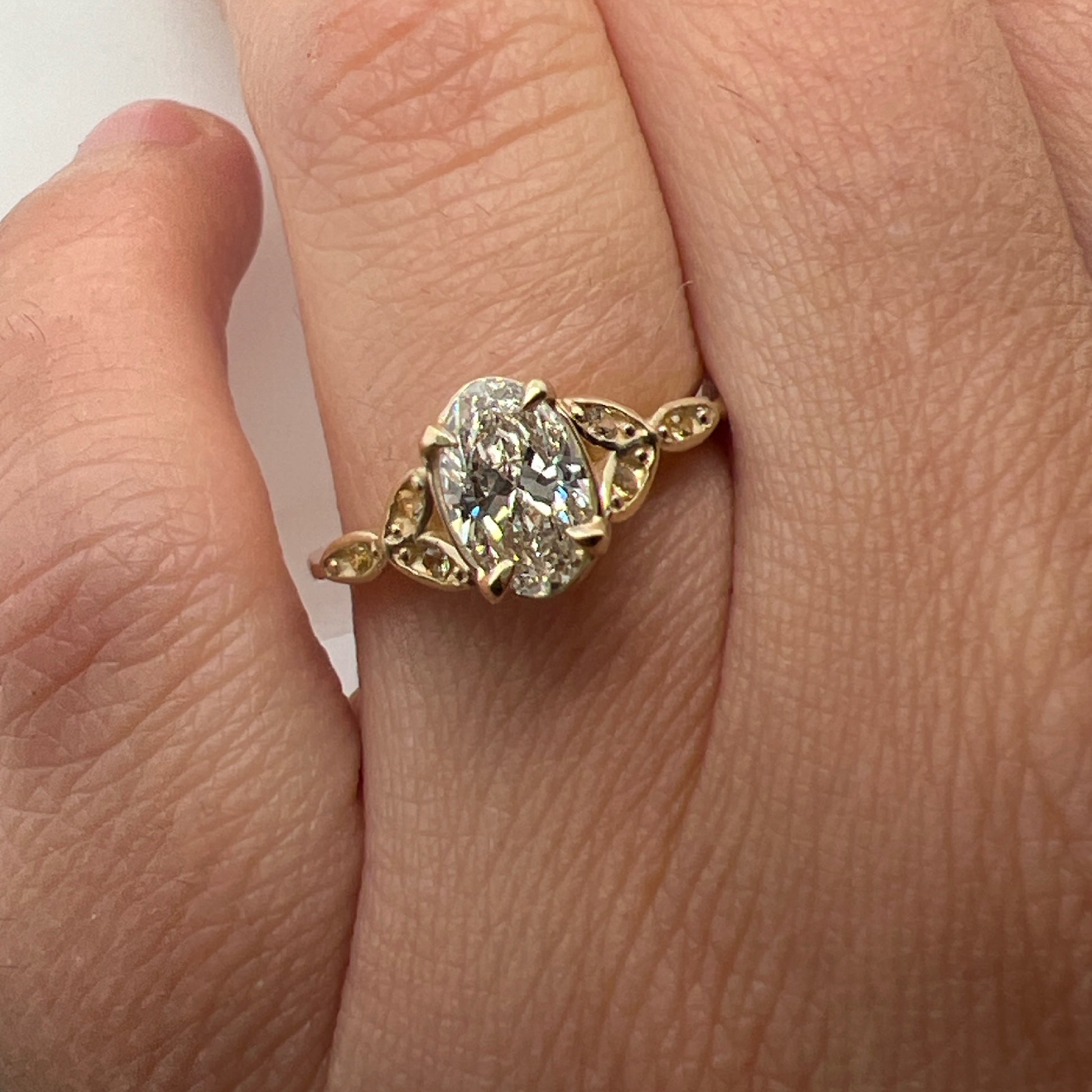 Our Petal style engagement ring in 14k yellow gold with 4 prong basket. The 1ct, I color, SI2 clarity reclaimed oval natural diamond with GIA report sits between petals flecked with yellow Montana sapphires.