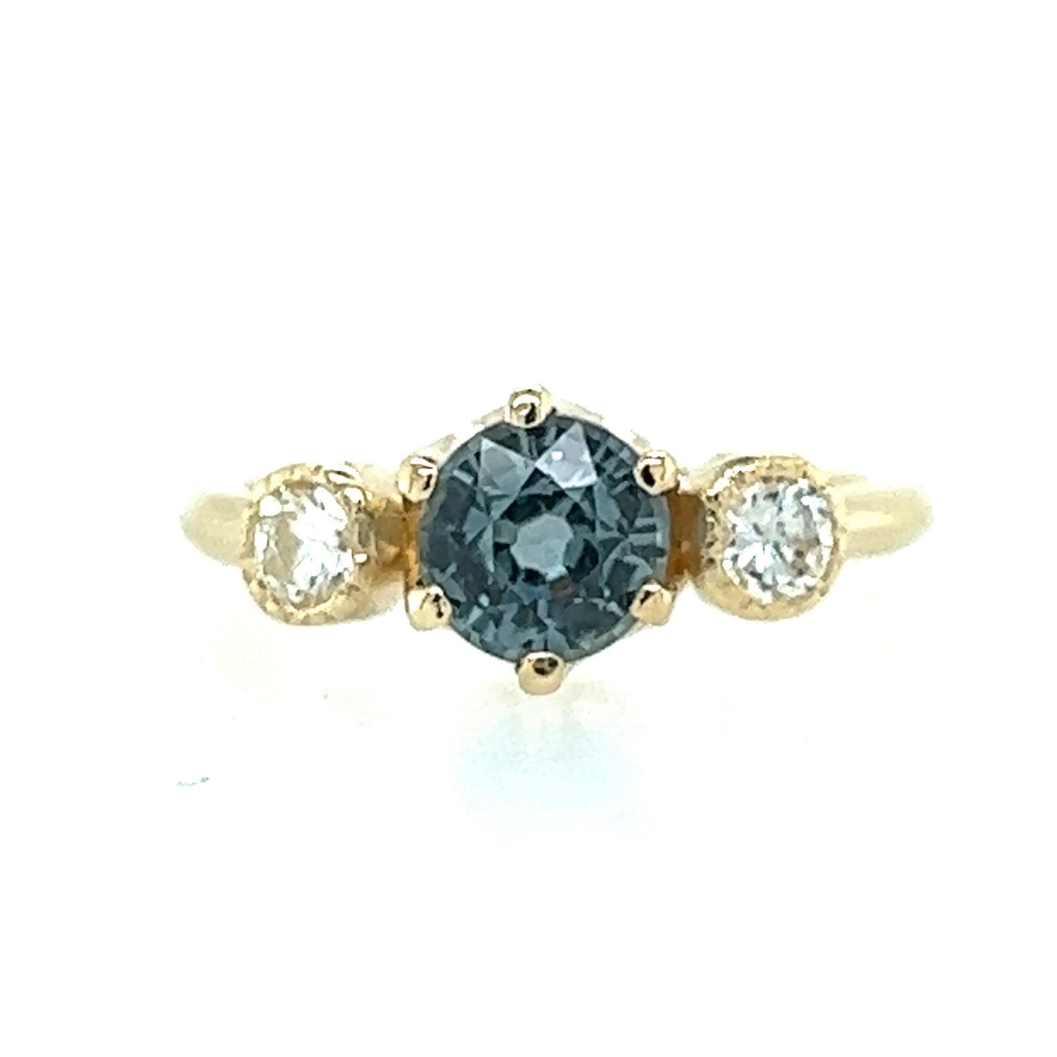Side stones are reclaimed round diamonds (H color, SI2 clarity) set in milligrain textured bezels.