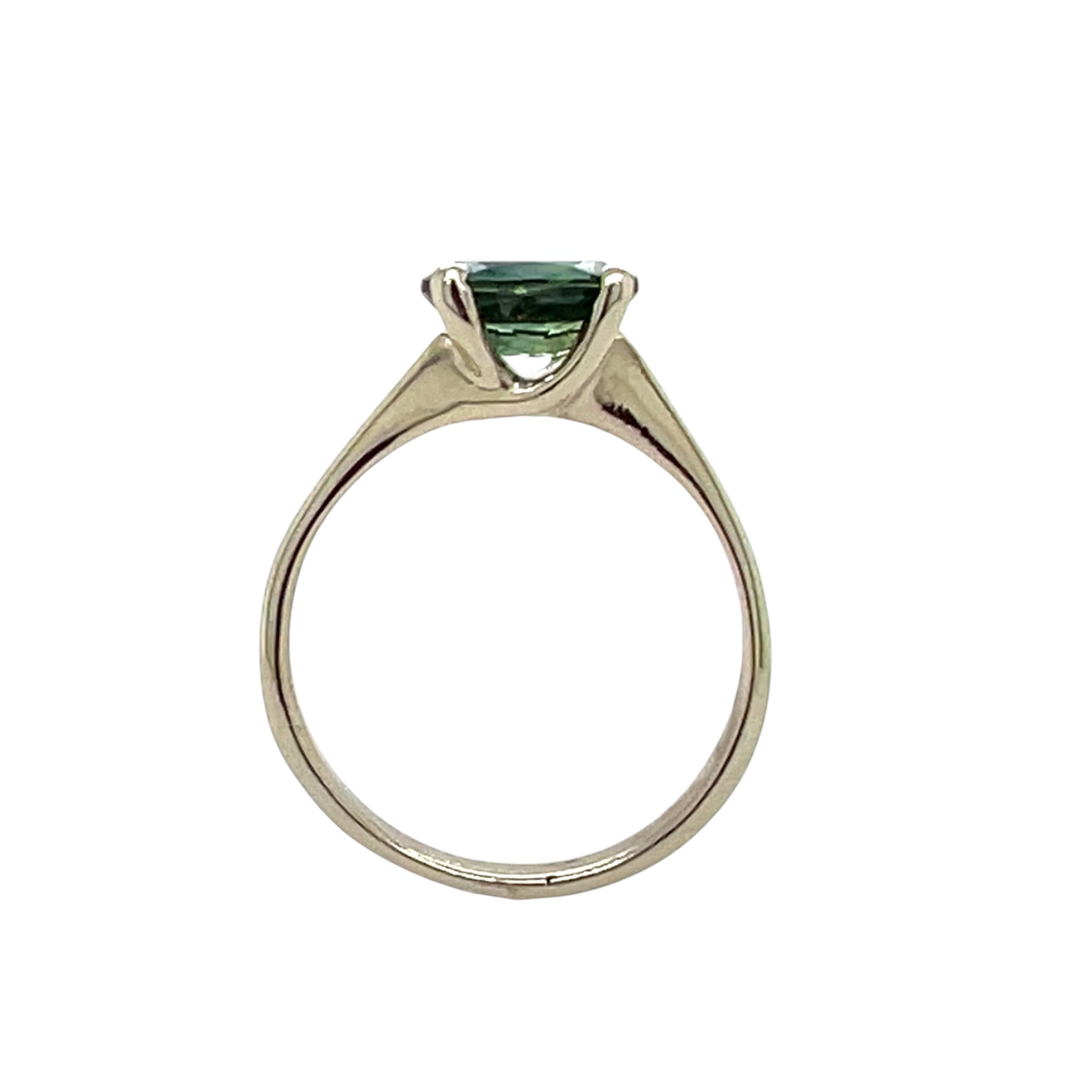 Our Woven Tapered Solitaire Engagement ring made in 14k white gold is east/west set with moody teal sapphire. Sapphire is from Australia and 1.27ct.